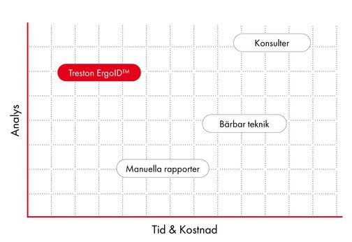 När man väljer en ergonomisk bedömningsmetod innebär beslutet ofta en kompromiss mellan analysdjupet samt kostnaden och tidsåtgången. Treston ErgoID® överbryggar dessa skillnader genom att kombinera AI-datorvisionssystemets noggrannhet med våra ergonomiexperters kunskap, vilket ger det bästa av två världar. Treston ErgoID® erbjuder en datadriven analys och expertrekommendationer, utan de avbrott eller kostnader som andra metoder medför.