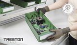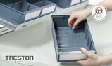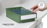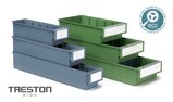 Lagerlådorna erbjuds i 11 olika storlekar som passar en rad olika förvaringsbehov. De finns i biobaserad plast, 100 % återvunnen plast eller klassisk plast, och är utformade för hållbarhet och flexibilitet. Lådorna staplas stadigt på varandra, även de som är olika långa, så länge de har samma bredd. Raka sidor och tvärgående avdelare som tillbehör garanterar effektivt utnyttjande av utrymmet. En etikett med skydd följer med varje låda som standard. Trestons lagerlådor är anpassade för alla metriska hyllor, skåp och industriella arbetsstationer, och ger en effektiv och flexibel förvaringslösning.
